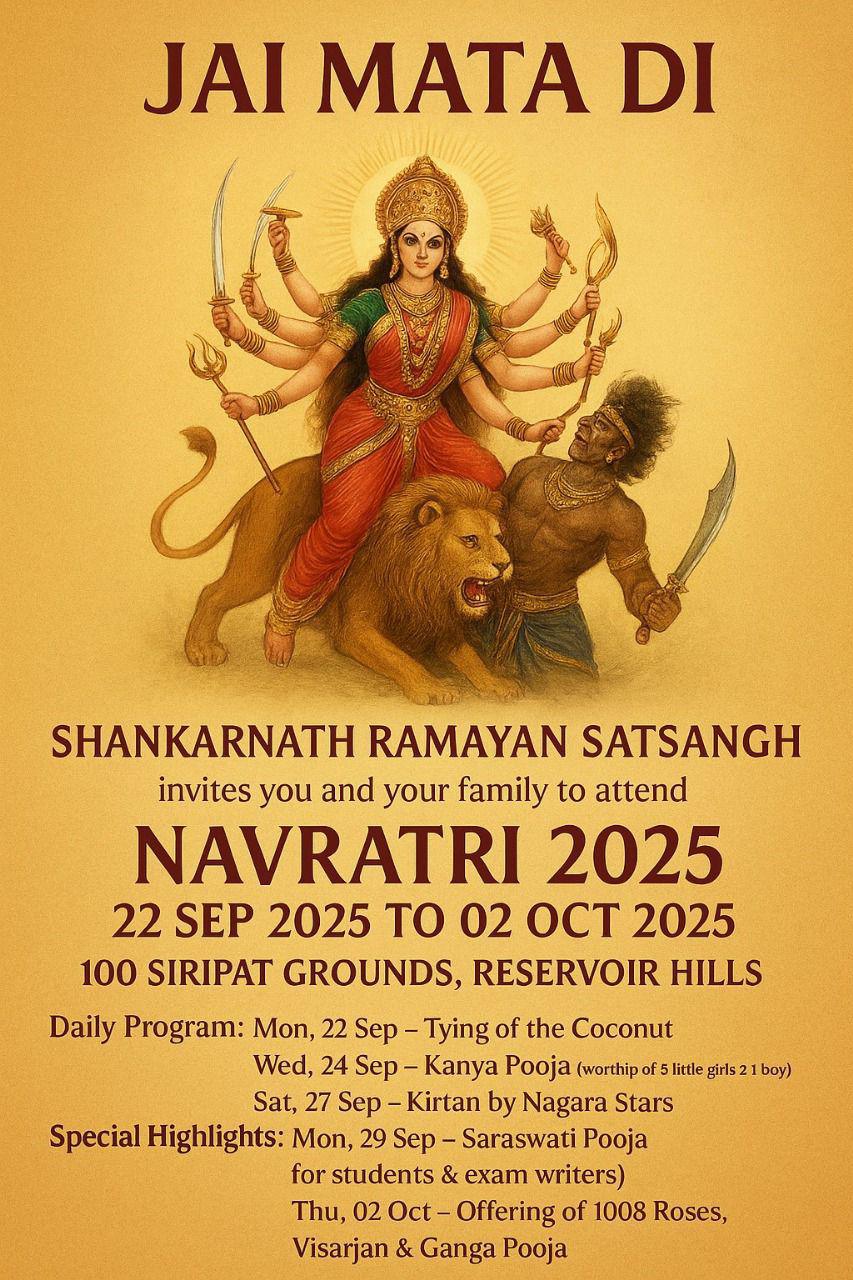 Shankarnath Ramayan Satsangh warmly invites you to join us in celebrating Navratri 2025, honouring the divine power of Mata Durga in all her forms.